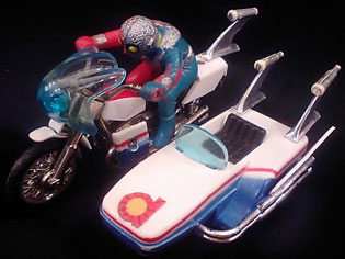 状態:箱ヤケ・いたみあり。本体メッキ部分いたみ・並品。 サイドマシーンより見かける機会は多いものの、なかなか完全な状態で見つけることが難しいアイテムでもあります。 透明フードをはじめとするその独特のフォルムがたまらない01兄さんのダブルマシーンを。
